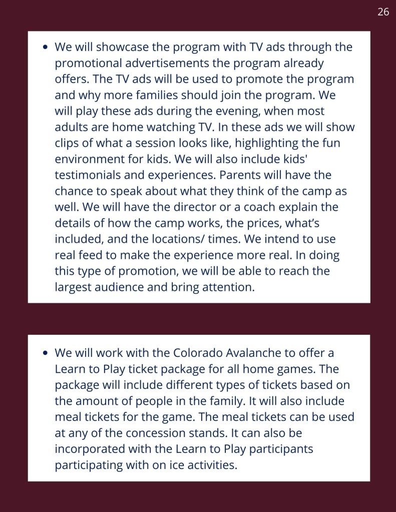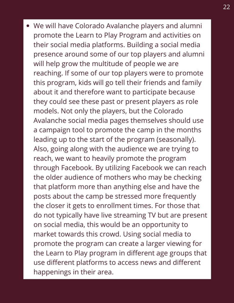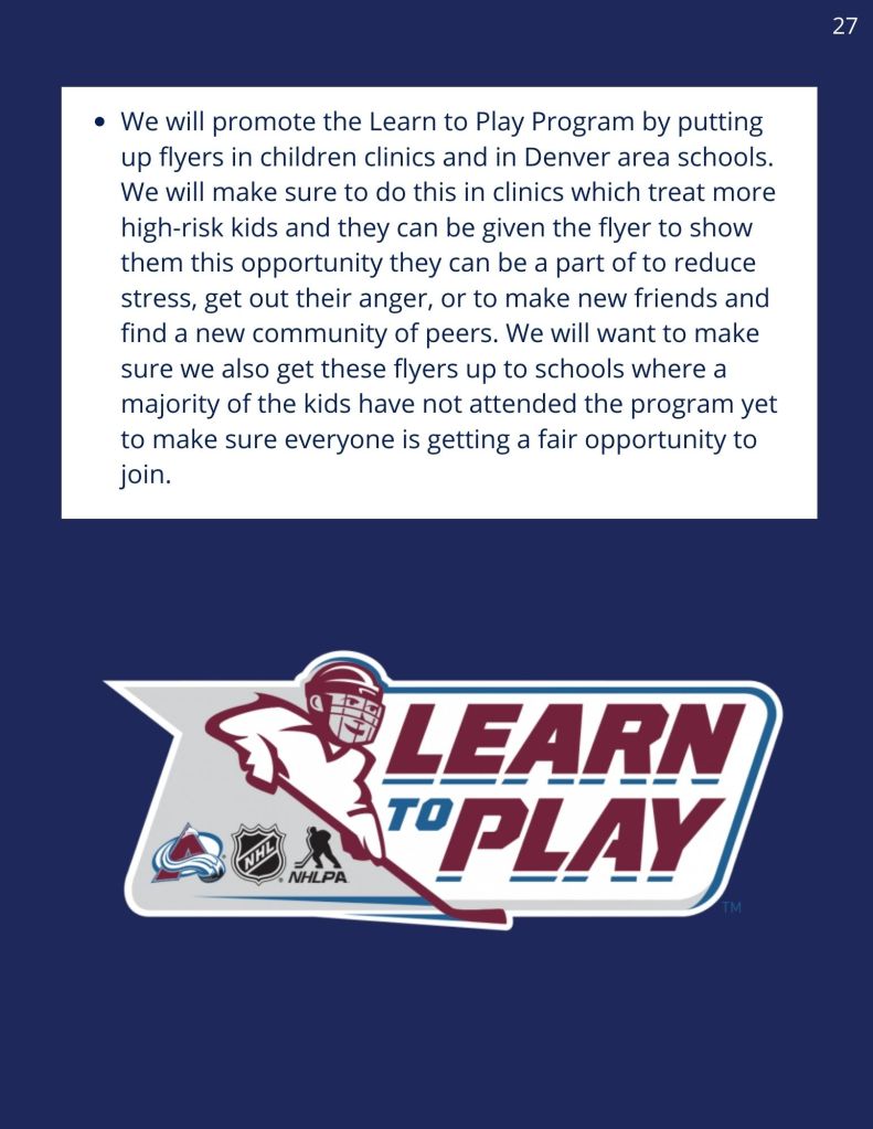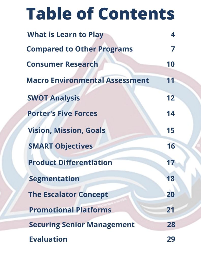Below is a Marketing Proposal that was written among my team in Sport Marketing. Among the team was myself, Bria Duvall, Morgan Hughes, and Meaghan Oosterhous. This marketing proposal was to help a Youth Hockey Program called Learn to Play that is based out of Denver, Colorado. The assignment was to create the marketing proposal but in a fun and creative way. I was in charge of designing the look and graphics, organizing all of the information, and creating some content.