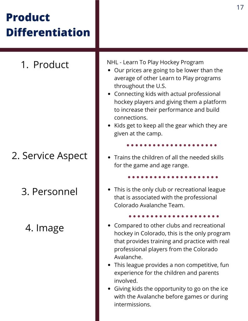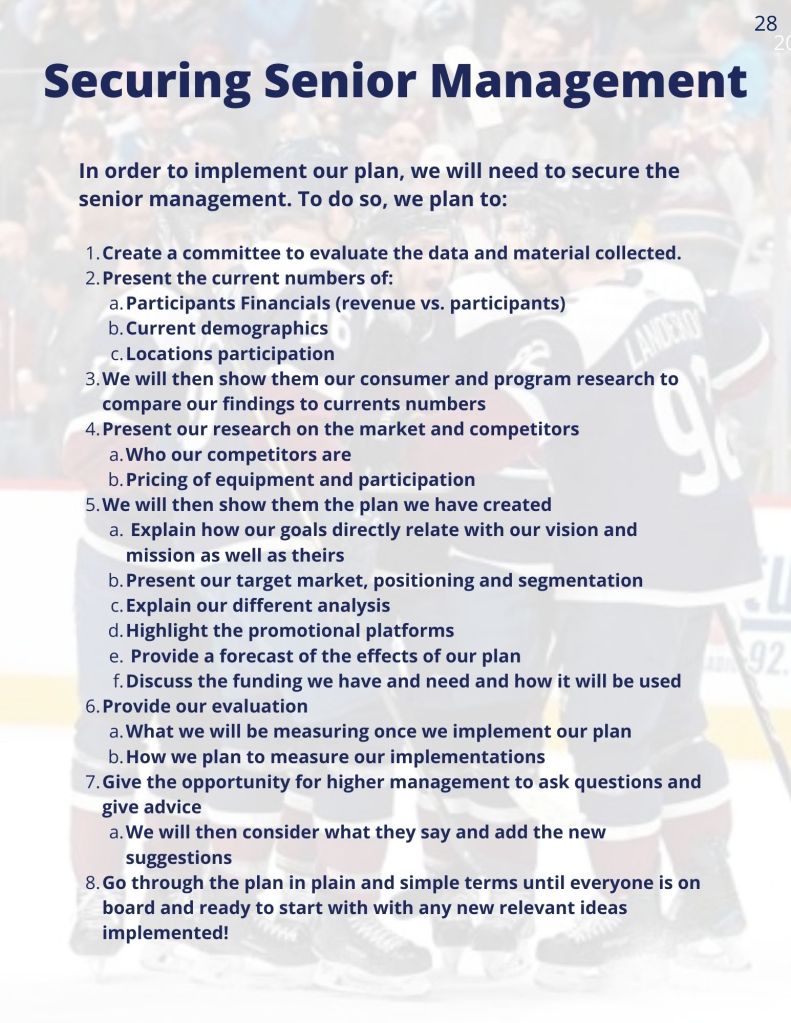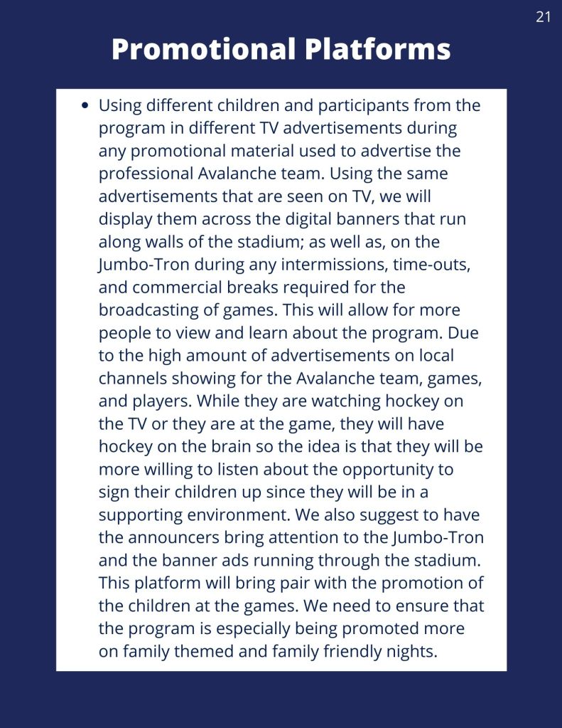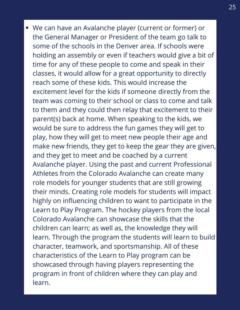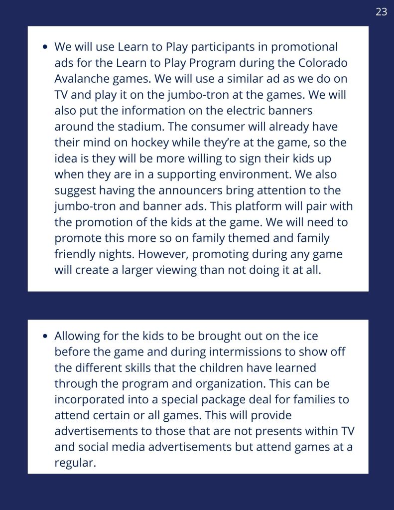 Below is a Marketing Proposal that was written among my team in Sport Marketing. Among the team was myself, Bria Duvall, Morgan Hughes, and Meaghan Oosterhous. This marketing proposal was to help a Youth Hockey Program called Learn to Play that is based out of Denver, Colorado. The assignment was to create the marketing proposal but in a fun and creative way. I was in charge of designing the look and graphics, organizing all of the information, and creating some content.