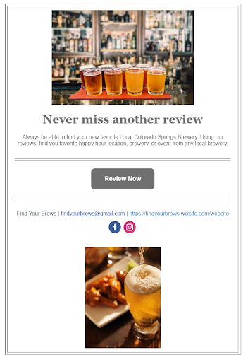 | 1st Week of 2nd Month | Weekly Email discussing up and coming breweries in the Colorado Springs area. | Short and Simple | For the Weekly follow up emails, we want to keep them short and simple to allow the user to make a choice on whether they want to learn more.This is useful in showing that we care about the users and that we as a company don’t want to waste our users time. |