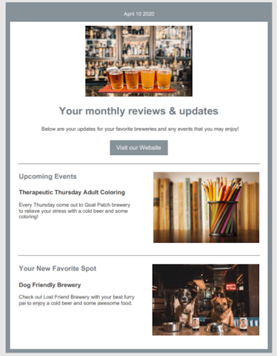 | 4th Week of 2nd Month | Email regarding all events that will be coming up in the next month. | Events for all consumers. | Using events from different breweries for different kinds of people will make users feel like they are all invited. Nights like Teacher nights, Adult Coloring, or Trivia nights will attract different groups with different interests. |
