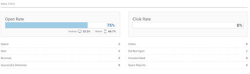 The results for the Welcome letter showed promising results for Find Your Brews. It provides a link to the website and reviews. It had a 62.5% open rate and had a click rate of 20%. Below is the dashboard that represents these results.